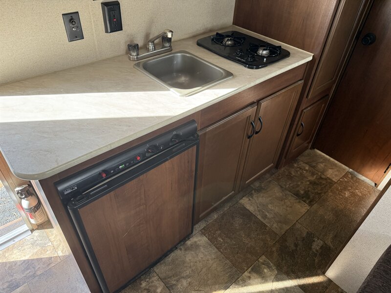 • Kitchen includes a 3-burner stove, oven, microwave, and refrigerator